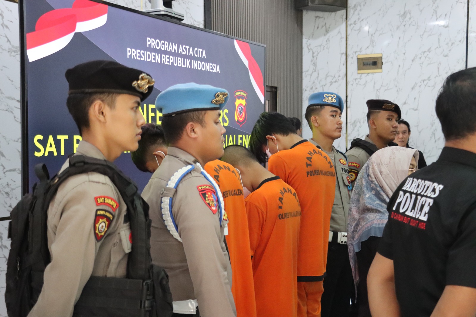 Kapolres menjelaskan bahwa para pelaku menjalankan aksinya dengan dua metode, yakni sistem tempel atau peta dan transaksi langsung atau COD. Mereka dijerat dengan berbagai pasal sesuai jenis pelanggaran, di antaranya Pasal 114, 112, dan 113 Undang-Undang Republik Indonesia Nomor 35 Tahun 2009 tentang Narkotika, serta Pasal 435 jo Pasal 138 Undang-Undang Nomor 17 Tahun 2023 tentang Kesehatan bagi pelaku peredaran obat keras tanpa izin edar. Ancaman hukuman yang dikenakan berkisar dari minimal 4 tahun hingga maksimal 12 tahun penjara.